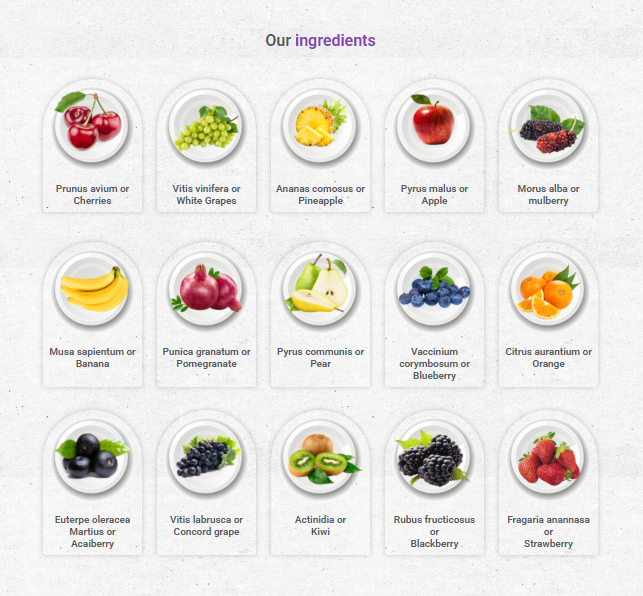 Enriched with antioxidant-rich fruits such as Cherries, White Grapes, Pineapple, Apple, Mulberry, Banana, Pomegranate, Pear, Blueberry, Orange, Acai Berry, Concord Grape, Kiwi, Blackberry, and Strawberry, combined with select herbal ingredients to support holistic wellness.